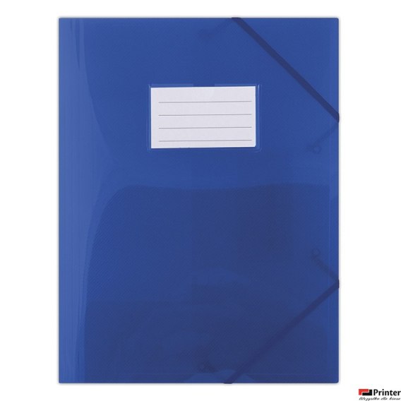 Wykonana ze sztywnego ekologicznego polipropylenu o grubości 480_m_3-skrzydłowa, półtransparentna_w delikatne prążki_zamykana za pomocą 2 płaskich, narożnych gumek w kolorze teczki z kieszonką i wymienną etykietą_rozmiar wewnętrznej kieszonki: 94x56mm_format: A4_rozmiar: 245x315mm_kolor niebieski