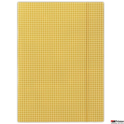 Wykonana z kartonu o gramaturze 400gsm_posiada Zielony Punkt (Der Gr_ne Punkt) - udział w systemie recyklingu i odzysku odpadów wynikający z przepisów prawa polskiego i UE_3-skrzydłowa_jednostronnie pokryta lakierem drukarskim o wysokim połysku_okrągła, pionowa gumka w kolorze teczki chroni zawartość przed wysunięciem_nadruk w kratę_format: A4_rozmiar: 232x317mm_kolor pomarańczowy