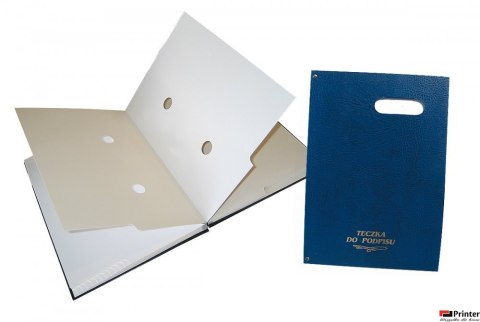 Teczka do podpisu z okienkiem Warta_- okładka twarda oklejana. Grzbiet harmonijka. Łączenie okładki z blokiem wzmocnione nitami. Na przedniej okładce okienko z szybką, pod którą można umieszczać napisy. _- blok z kartonu barwionego w masie zawiera 20 kart z 2 otworami i wyciętymi registrami_- jednostka sprzedaży 1 sztuka