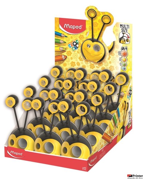 Temperówka CROC CROC UNIVERSAL w kształcie pszczółki. Unikalny i wyjątkowy pomysł marki Maped. Dwuotworowa temperówka z pojemnikiem, dzięki nasadkom w czułkach może temperować kredki lub ołówki aż w czterech średnicach: 8, 11, 13 i 16 mm. Przyjazny wygląd sprawia, że doskonale sprawuje się jako maskotka na domowym biurku i szkolnej ławce.