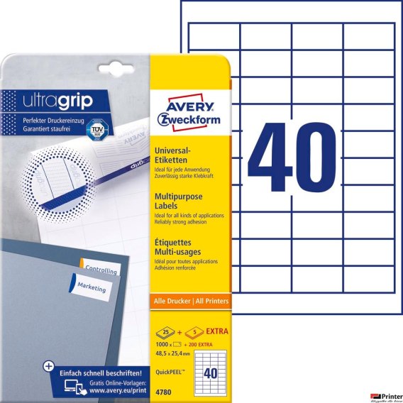Technologia druku:•INK JET: Tak•LASER: Tak•LASER COLOR: Tak•KSERO: TakCechy produktu:•Rozmiar etykiety (mm): 48,5 x 25,4•Etykiet / arkusz: 40•Arkuszy/ opakowanie: 30•Etykiet/ opakowanie: 1200•Kolor: białe•Format: A4•Rzędów/ arkusz: 4x10•Certyfikaty: FSC