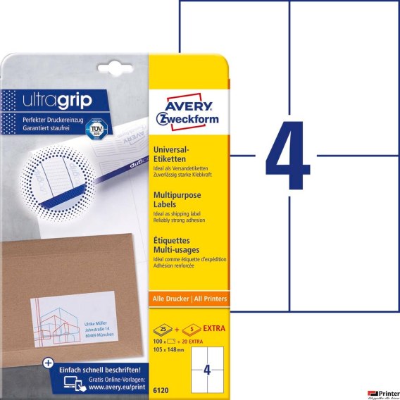 | Katalog_2020naz | Etykiety uniwersalne A4 25 arkuszy + 5 arkuszy Extra 105 x 148 mm białe Avery Zweckform |