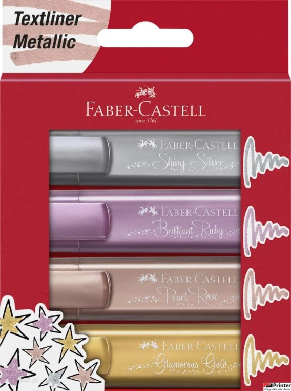 Zestaw zakreślaczy 1546 Faber-Castell 4 szt. w metalicznych kolorach w opakowaniu kartonowym. Wysokiej jakości błyszczące kolory, idealne do zaznaczania, podkreślania i wyróżniania. Efekt metaliczny zmienia się pod różnym oświetleniem. Odpowiednie do wszystkich rodzajów papierów. Uniwersalny tusz na bazie wody. Odporne na rozmazywanie. Ze ściętą końcówką o szerokości linii pisania 1 - 5 mm. Dostępne w różnych kolorach i zestawach.