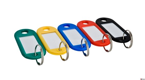 Plastikowe zawieszki do kluczy, posiadają zabezpieczone przezroczystą folią okienko do wpisania numeru pomieszczenia