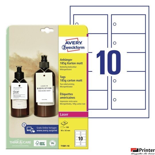 Zawieszki kartonowe Avery Zweckform, 185g, mikroperforowane, 90 x 50 mm, 10 ark. T1001-10