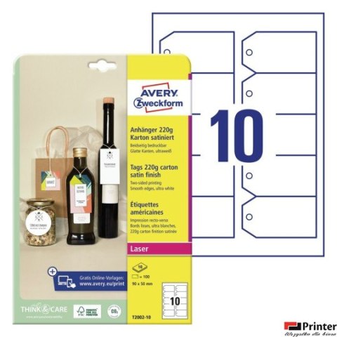 • Zawieszki kartonowe Avery Zweckform, 220g, Quick&Clean, 90 x 50 mm, ścięte rogi, 10 ark. T2002-10