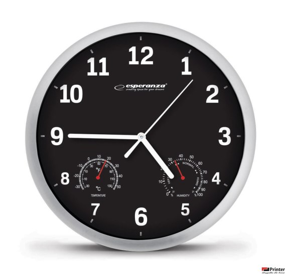 Nasz zegar ścienny Esperanza LYON służy nie tylko do pokazywania czasu - można na nim odczytać też temperature oraz wilgotność otoczenia. Jego wzornictwo sprawia, iż udekorujesz nim każde mieszkanie, biuro, sklep czy restaurację.__ ___ Średnica zegara: 25 cm___ Grubość zegara: 3,6 cm___ Rama zegara z wysokiej jakości tworzywa sztucznego___ Tarcza zegara ze specjalnego artystycznego papieru___ Cichy i bardzo precyzyjny mechanizm kwarcowy___ Zakres mierzonej temperatury: -30 _C _ + 50 _C (-30 _F _ 110 _F)___ Zakres pomiaru wilgotności: 0 _ 100%___ Hak do motażu na ścianie w zestawie___ Zasilanie: 1 x bateria 1,5V AA (niezałączona)