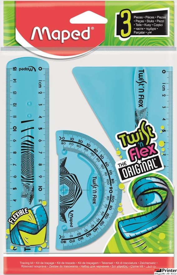 Zestaw linijek niełamliwych TWIST N FLEX. Giętkie linijki mogą być zwijane, skręcane i wyginane bez ograniczeń. Zawartość: linijka 15 cm, ekierka 60° - 15 cm, kątomierz 180°. Pudełko 10 sztuk. JS 1 szt.