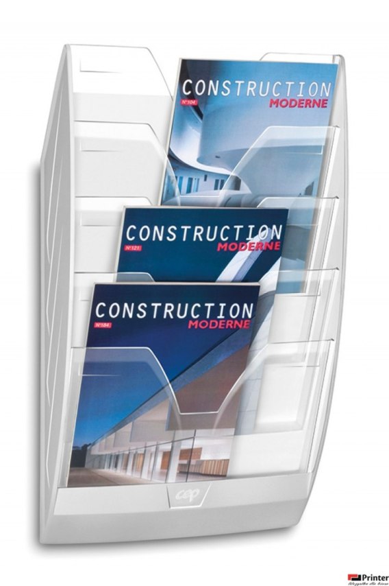 Stylowy zestaw 5 półek przeznaczony na dokumenty w formacie A4, wykonany z odpornego na pęknięcia i odkształcenia polistyrenu w 100% nadającego się do recyklingu_wewnątrz mieści kartki lub wydruki o maksymalnym rozmiarze 24x32cm_duży kąt ułatwia wkładanie i wyjmowanie dokumentów_opcja łączenia zestawów w pionie lub poziomie_mocowany za pomocą dwóch śrub - akcesoria do prostego i szybkiego montażu w komplecie_pojemność jednego przedziału: 325x26mm_wymiary: 580x122x350mm_kolor przeźroczysty