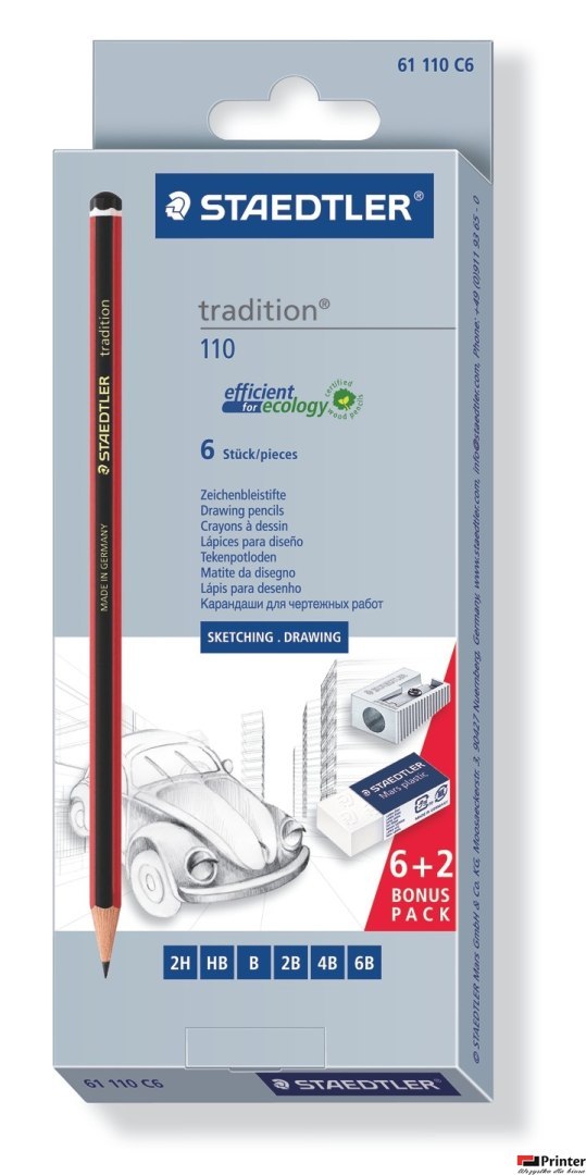 Zestaw ołówków tradition, 6 szt. (2H, HB, B, 2B, 4B, 6B), + gumka + temperówka, Staedtler S 61 110 C6
