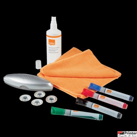 • Zestaw startowy Nobo do tablic suchościeralnych, zawiera: markery, gąbke, piankę do czyszczenia, ściereczke oraz magnesy 1905330